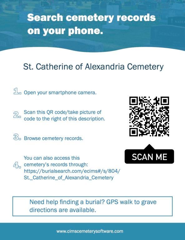You can now search the records of the St. Catherine of Alexandria Cemetery with GPS directions by scanning the QR code or by clicking here!